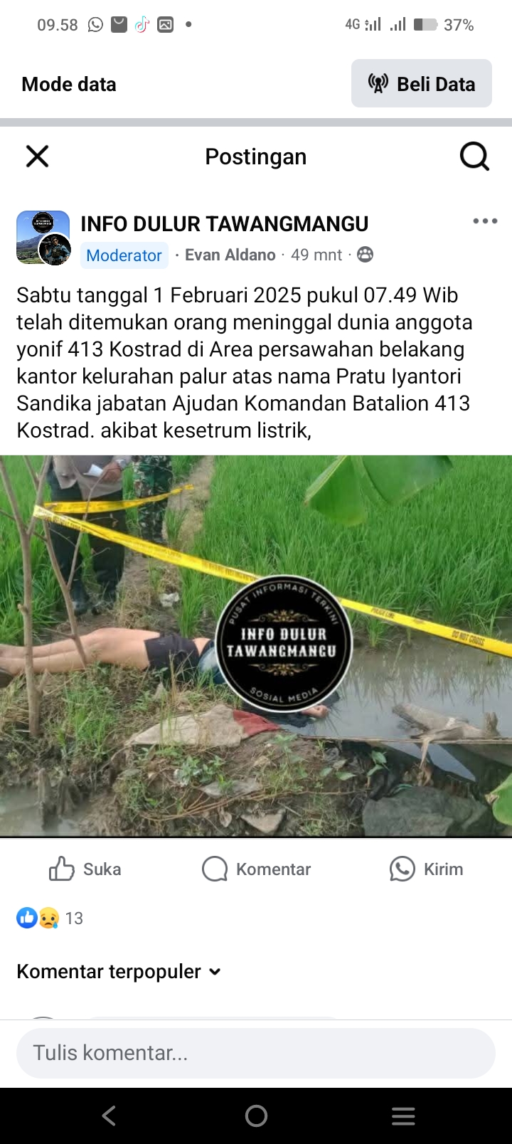” sedang lari pagi lwt area sawah tdk tahu sawahnya ada aliran listrik utk menjebak tikus,,, kesetrum. ” Jawab Evan dalam komen di postingan grup fb sedulur Tawangmangu.