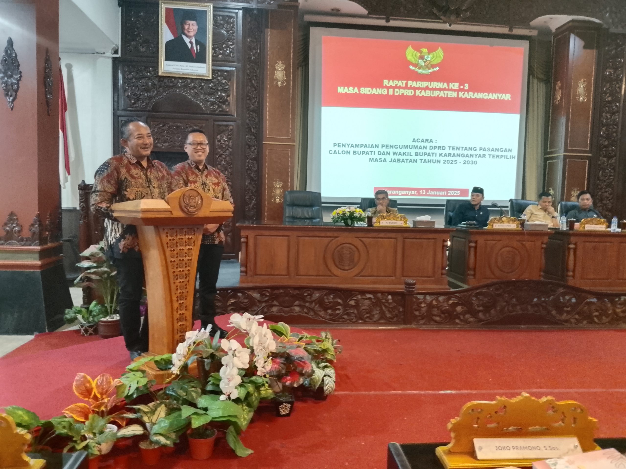 Surat pengumuman penetapan bupati dan wakil bupati terpilih Karanganyar periode 2025 – 2030 tersebut di bacakan oleh wakil pimpinan DPRD Karanganyar Anung Marwoko setelah sebelumnya di buka oleh ketua DPRD Bagus Selo.
