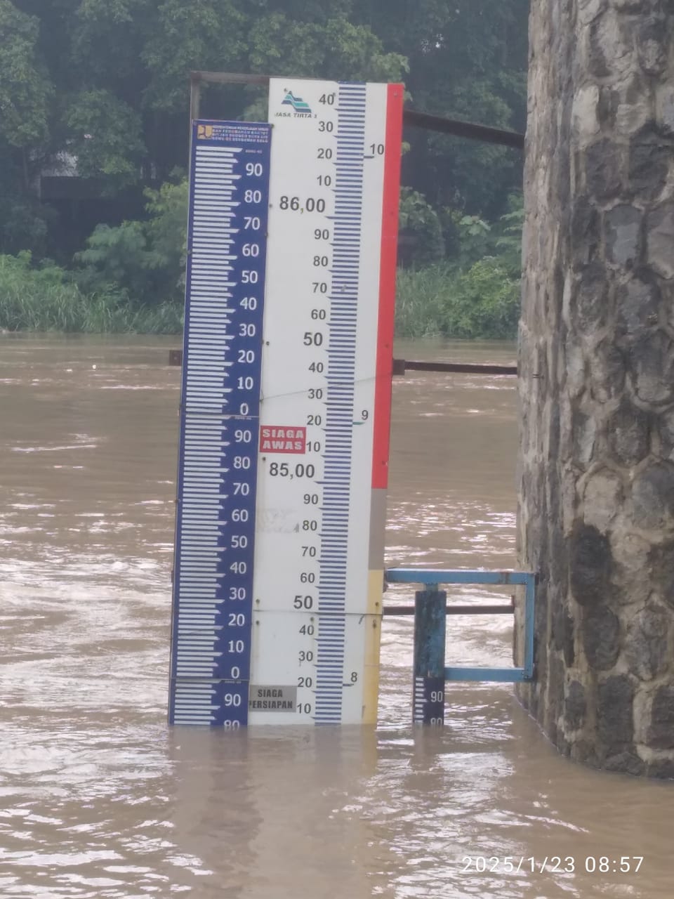 Pada pagi hari ini pukul 09.00 Kamis, 23 Januari 2025 elevasi aliran sungai bengawan solo yang tampak di pos pantau jurug menunjukan bahwa TMA ( Tinggi Muka Air) dengan kondisi SH = 6,75mtr SK = 7,75 SM = 8,75 status siaga kuning atau berarti dalam tahap persiapan banjir untuk daerah bantaran sungai bengawan Solo.