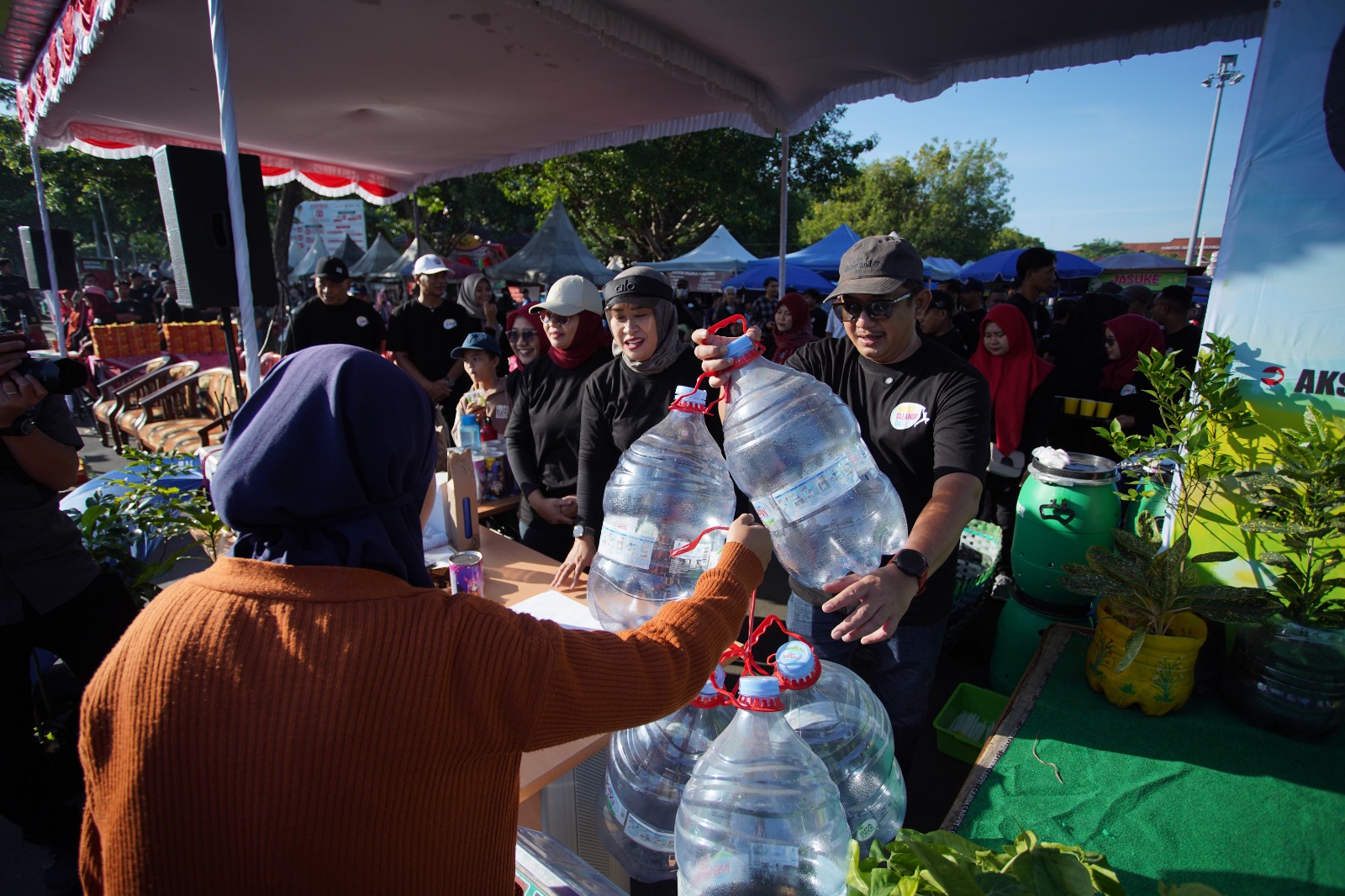 Masyarakat yang hadir dengan membawa galon bekas kemasan air mineral tersebut menukarkan dengan berbagai macam hadiah yang di berikan langsung oleh bupati Karanganyar Rober Christanto.